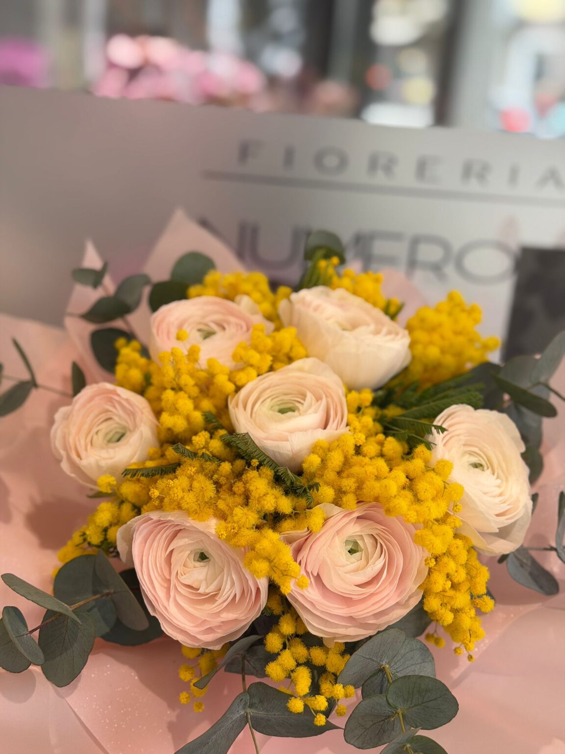 Bouquet di 7 ranuncoli e mimosa. Ogni ranuncolo in più +4,00€.
