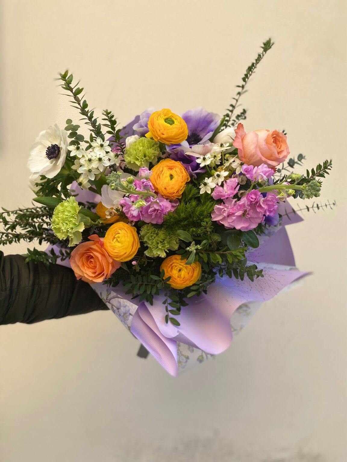 Bouquet Primavera (anemoni,ranuncoli,violaciocca,ornitogallo,garofani e verde decorativo)