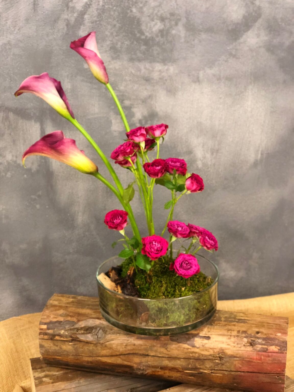 Centro tavola moderno in vaso di vetro con calle e roselline ramificate fucsia.
