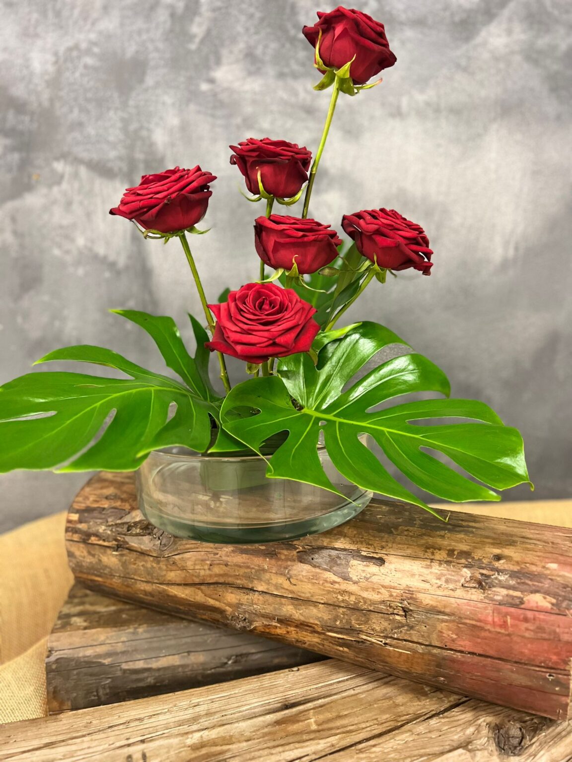 Centro tavola moderno in vaso di vetro con rose rosse e foglie di monstera.